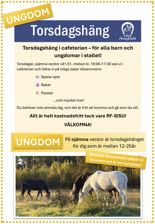 Alla tillfällen är gratis för dig som rider på GPK, och det bästa av allt; du får gå på hur många tillfällen du vill! Du är alltså inte bunden till att gå på det tillfället som är din ordinarie riddag. Passa på att lära dig massor av häst- och ridkunskap!